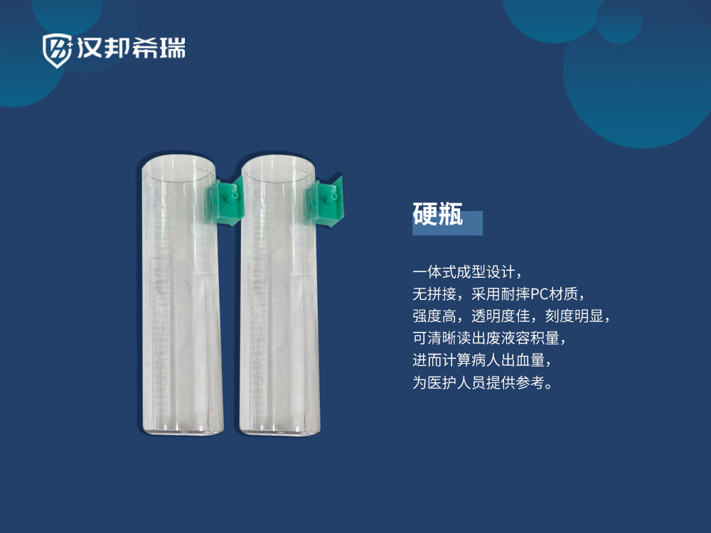 一體式成型設(shè)計,無拼接,采用耐摔PC材質(zhì),強度高,透明度佳,刻度明顯,可清晰讀出廢液容積量,進而計算病人出血量,為醫(yī)護人員提供參考。