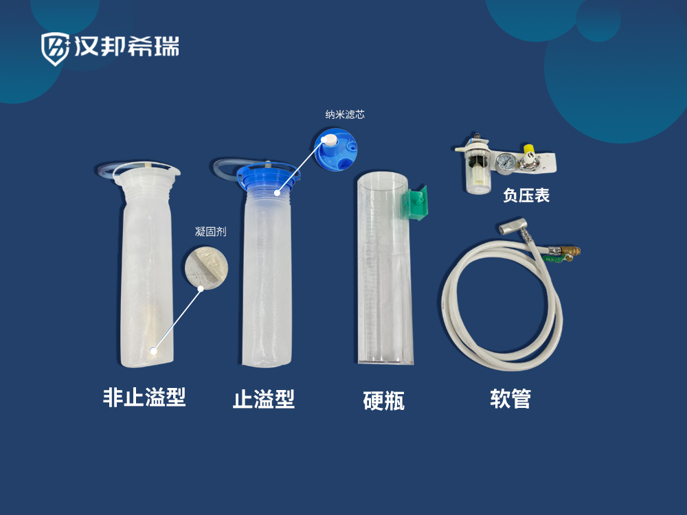 由軟袋體、止溢閥、納米濾芯、凝固劑、硬瓶、負壓表、引流導管組成。