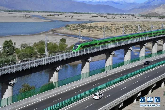 試運(yùn)行的復(fù)興號(hào)列車(chē)行駛在雅魯藏布江畔(6月16日攝)。新華社記者 覺(jué)果 攝
