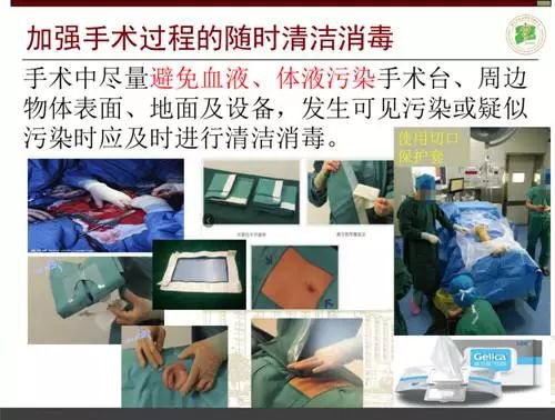 · 手術(shù)中盡量避免血液、體液污染手術(shù)臺(tái)、周邊物體表面、地面及設(shè)備,發(fā)生可見(jiàn)污染或疑似污染時(shí)應(yīng)及時(shí)進(jìn)行清潔消毒,術(shù)中清潔消毒推廣使用消毒濕巾。