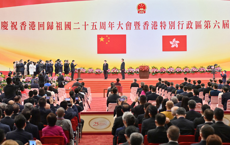新華社香港7月1日電(記者 陳鍵興 朱基釵 趙博)慶祝香港回歸祖國25周年大會暨香港特別行政區(qū)第六屆政府就職典禮1日上午在香港會展中心隆重舉行。中共中央總書記、國家主席、中央軍委主席習(xí)近平出席并發(fā)表重要講話。他強(qiáng)調(diào),25年來,在祖國全力支持下,在香港特別行政區(qū)政府和社會各界共同努力下,“一國兩制”實踐在香港取得舉世公認(rèn)的成功?!耙粐鴥芍啤笔墙?jīng)過實踐反復(fù)檢驗了的,符合國家、民族根本利益,符合香港、澳門根本利益,得到14億多祖國人民鼎力支持,得到香港、澳門居民一致?lián)碜o(hù),也得到國際社會普遍贊同。這樣的好制度,沒有任何理由改變,必須長期堅持。