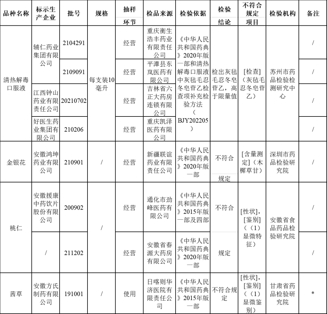 經(jīng)安徽省食品藥品檢驗研究院檢驗,標(biāo)示為安徽援康中藥飲片股份有限公司生產(chǎn)和抽取自安徽省春源大藥房有限公司的2批次桃仁不符合規(guī)定,不符合規(guī)定項目包括性狀、顯微鑒別。