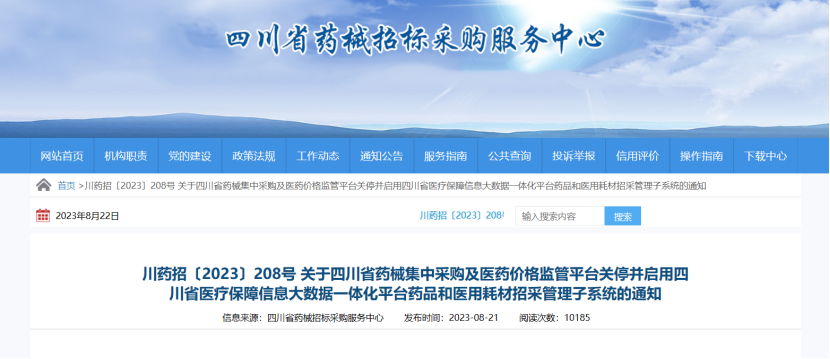8月21日,四川省藥械招標(biāo)采購服務(wù)中心發(fā)布《川藥招〔2023〕208號 關(guān)于四川省藥械集中采購及醫(yī)藥價(jià)格監(jiān)管平臺(tái)關(guān)停并啟用四川省醫(yī)療保障信息大數(shù)據(jù)一體化平臺(tái)藥品和醫(yī)用耗材招采管理子系統(tǒng)的通知》。 其中明確,按照國家醫(yī)療保障局相關(guān)文件要求和四川省醫(yī)療保障信息大數(shù)據(jù)一體化平臺(tái)建設(shè)進(jìn)度安排,四川省藥械集中采購及醫(yī)藥價(jià)格監(jiān)管平臺(tái)(以下簡稱:省藥采平臺(tái))業(yè)務(wù)信息系統(tǒng)將于2023年8月22日0點(diǎn)關(guān)停,并于8月28日9點(diǎn)開放四川省醫(yī)療保障信息大數(shù)據(jù)一體化平臺(tái)藥品和醫(yī)用耗材招采管理子系統(tǒng)(以下簡稱:招采子系統(tǒng))試用并調(diào)試,9月1日正式啟用。