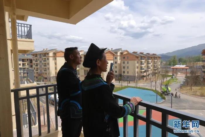 在四川省昭覺(jué)縣城易地扶貧搬遷安置點(diǎn)南坪社區(qū),剛搬遷到新家的“懸崖村”村民莫色達(dá)體夫婦在陽(yáng)臺(tái)給親戚打電話(huà)(2020年5月13日攝)。新華社記者 江宏景 攝